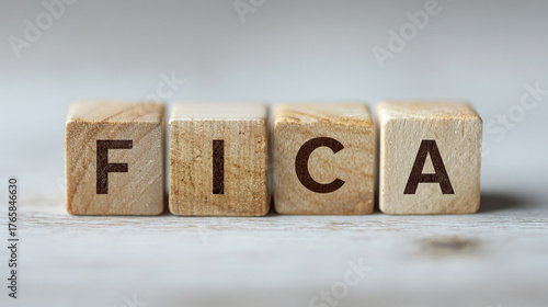 Minimalist composition of wooden blocks spelling “FICA” on a bright white table. Soft lighting emphasizes modern simplicity, symbolizing savings, healthcare, and investment concepts.