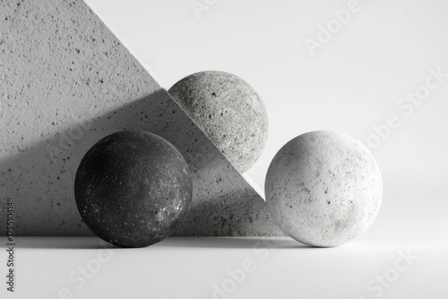Minimalist composition with concrete spheres and a triangle simple geometric shapes for architectural design isolated on white background