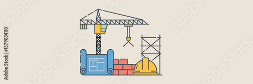 Minimalist construction site icon set with crane, blueprint, bricks, and scaffolding