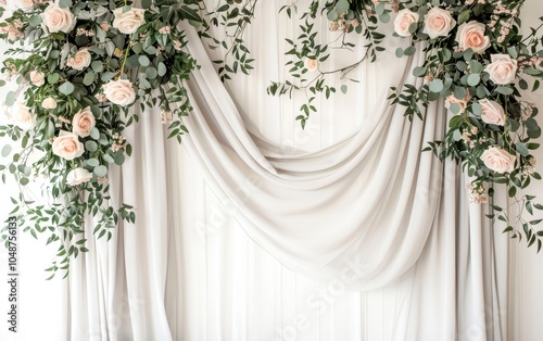 Minimalist Contemporary studio backdrop with a matte finish, crisp white curtains with light gray linen draping, accented by delicate pale pink roses and trailing eucalyptus for a sleek, elegant touch