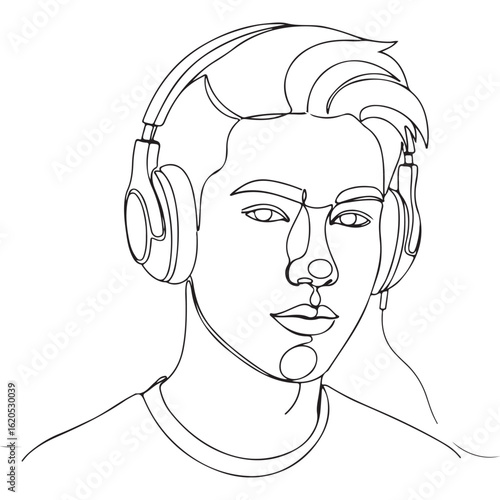Minimalist continuous line art illustration of a young man wearing headphones, depicting a modern portrait on a clean white background.