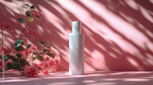 Minimalist Cosmetic Bottle Against Soft Pink Background with Natural Floral Elements Showcasing Beauty and Skincare Product Styling