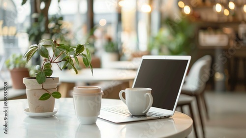 Minimalist Co-Working Space and Coffee Shop: White Tabletop with Laptop in Indoor Seating Area
