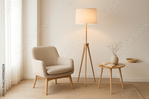 minimalist decor, lamp, lighting. A cozy minimalist living space with a beige armchair, tripod floor lamp, round wooden side table, and decorative vase against a neutral-toned wall.