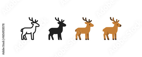 Minimalist deer icons in various styles: outline, silhouette, flat, and filled designs