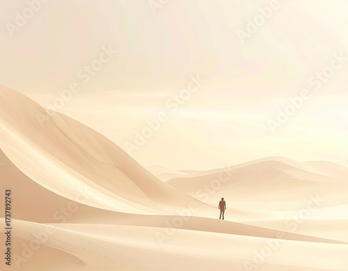 Minimalist Desert Landscape Silhouette of a Person Walking in Sand Dunes Soft Pastel Colors, Atmospheric Perspective and Dreamy Vibe