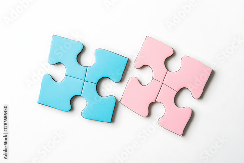 Minimalist design of two interlocked blue and pink puzzle pieces on a white background, concept of unity and connection