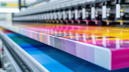 Minimalist digital printing factory, colorful inkjet printers at work, detailed and sleek machinery, bright and modern, efficient design