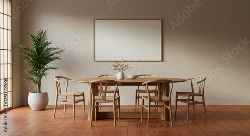 Minimalist dining room, Scandinavian design, wooden table, wishbone chairs, pendant light, potted plant, neutral tones, warm lighting, parquet flooring, textured wall, mid-century modern sideboard, se