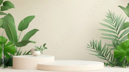 Minimalist display with circular platforms and lush green plants for aesthetic purposes.