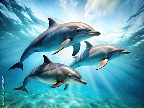 Minimalist Dolphin Photography: Four Playful Dolphins Swimming Gracefully in Vibrant Underwater Scene