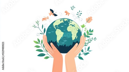 Minimalist Earth Day illustration featuring hands holding the planet with blooming plants, symbolizing sustainability and global environmental care