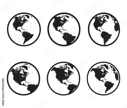 Minimalist earth globe icon set – Classic black and white earth designs. Silhouette world map and globe.