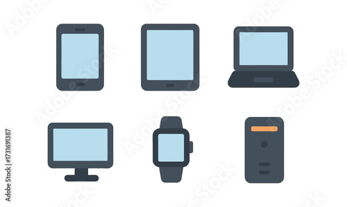 Minimalist electronic devices set featuring tablet, laptop, monitor, smartwatch, and desktop icons
