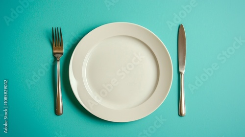 Minimalist Elegance Clean White Plate on Teal Surface, Symmetrical Layout for Culinary Creativity and Modern Sophistication