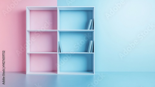 Minimalist empty bookshelf, white metal frame, clean design, light pastel-colored background