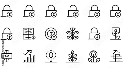 Minimalist financial and growth icons – lock, currency, plant, chart, and investment symbols for finance and sustainability