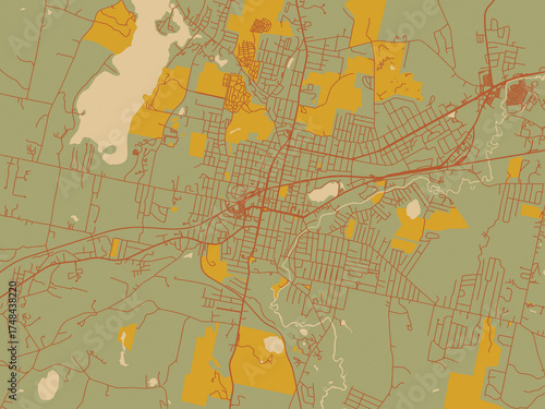 Minimalist flat city map of Pittsfield, Massachusetts with sage green ground with rust-red roads and ochre accents.