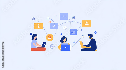 Minimalist flat illustration of people and laptops connected by social network connections, light blue background with orange accents, icons for video call, "Dave Mc height", "in maximum AI Editing.