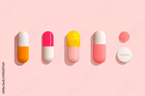 Minimalist flat illustration of various pills and capsules, clean design, simple medical concept, colorful medication icons