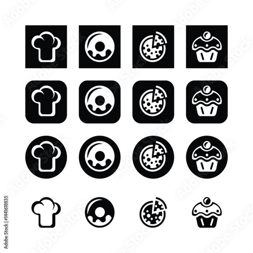 Minimalist Food Icons Featuring Chef Hat Donut Pizza And Cupcake In Black And White Palette