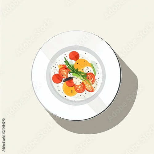 Minimalist food, single dish with simple garnish, top view, flat design illustration