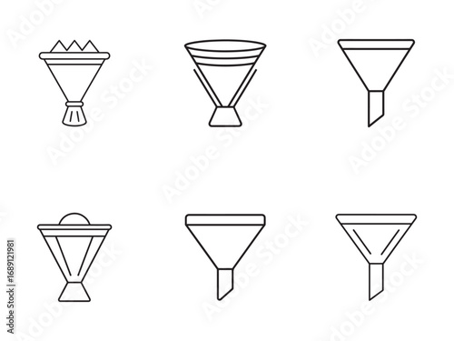 Minimalist Funnel Icon Set for Chemical Science and Conversion Processes in Black and White Outline Style