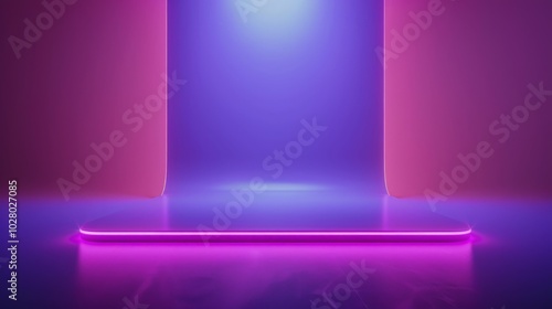 Minimalist futuristic gallery interior illuminated by a glowing neon rectangle