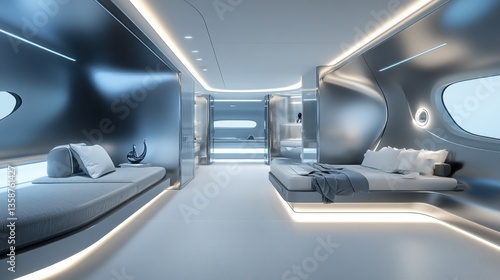 Minimalist futuristic spaceship interior, clean metallic walls, soft blue illumination, a sleek and modern tech atmosphere