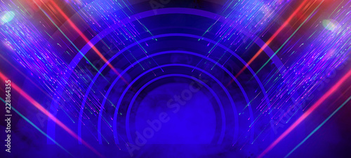 Minimalist, geometric dark abstract background. Empty stage with arch, neon light and smoke. 3d render.