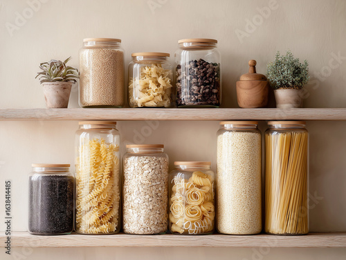 Minimalist glass storage jars with pasta and grains on pantry shelf