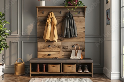 Minimalist Gray Driftwood Hall Tree with Shoe Storage and Coat Rack on Entryway Wall Unit
