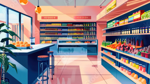 Minimalist grocery shopping highlighting vibrant colors and textures, highly detailed and vibrant, realistic yet creative depiction, emphasizing context and action