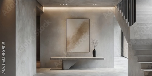 Minimalist hallway with a sleek console table, abstract artwork, and soft lighting