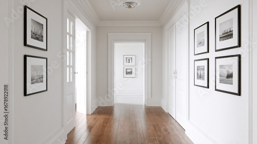 Minimalist hallway with framed art on white wall