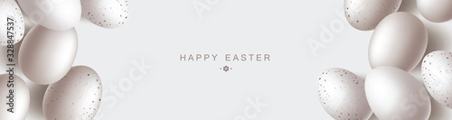 Minimalist Happy Easter Stylish Background with Natural White eggs Decoration and Greeting Text. Vector total White Easter Concept with realistic 3d eggs. Flat Lay. Top View
