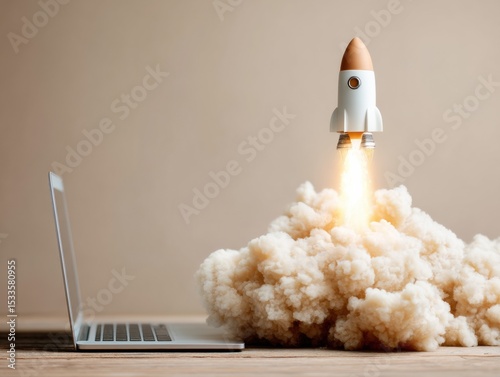 Minimalist Hardware Startup Rocket Launching from Laptop with Dramatic Cloud Trail Symbolizing Tech Innovation and Rapid Digital Growth