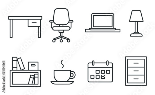 Minimalist home office line icons set – outline, workspace, productivity symbols