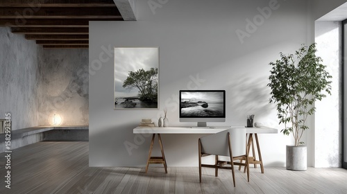 Minimalist home office with an iMac, clean concrete walls, and soft natural light, showcasing Scandinavian design elements, with framed landscape photography on the wall.