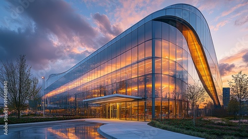 Minimalist hospital entrance lit warmly at dusk, glass facade mirroring clouds and light from a dramatic twilight skyline