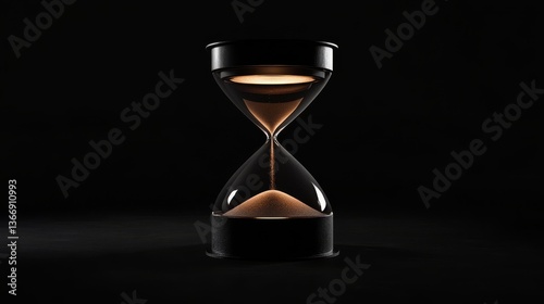 Minimalist hourglass form with sand trickling down, stark black environment, rim lighting effect, deep contrast shadows, fine art still life, philosophical time concept, dramatic studio capture