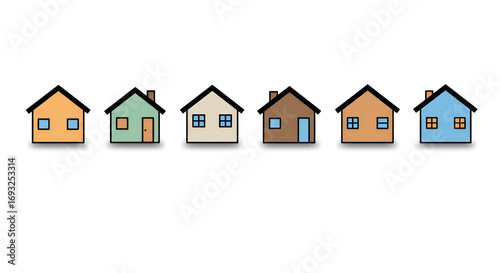 Minimalist house icons arranged in a row with simple design, showing different shapes and window variations.