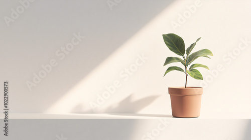 Minimalist houseplant in a simple clay pot on a sleek, white shelf, with empty wall space around it and soft shadowing from overhead lighting