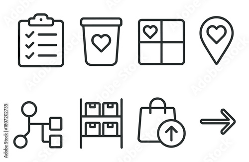 Minimalist icon set: checklist, heart, location, shopping, workflow, storage