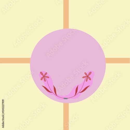 Minimalist illustration of a pastel pink oval adorned with subtle flowers/leaves, against a simple yellow grid backdrop.