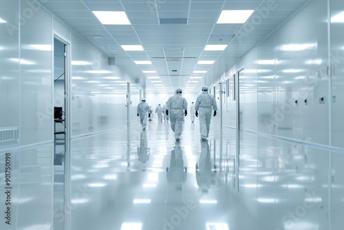Minimalist image of scientists walking in cleanroom corridor with reflective floors