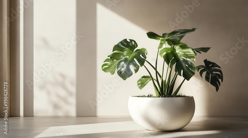minimalist indoor garden featuring a sculptural white planter with a striking monstera plant casting dramatic shadows