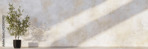 Minimalist indoor space featuring a potted plant and soft sunlight in the background