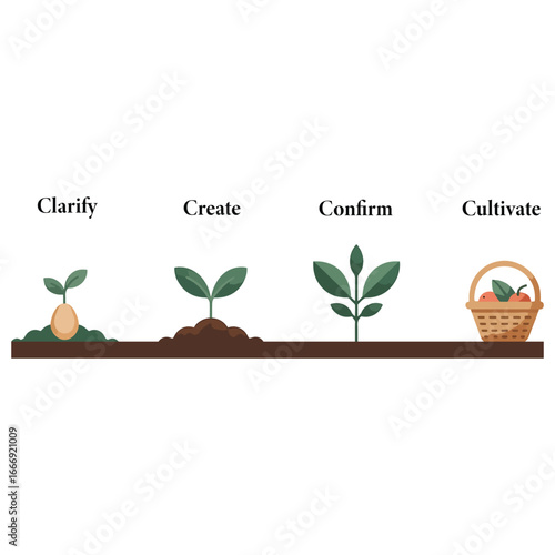 Minimalist infographic showing four stages of growth from seed to harvest. Business process and development vector illustration