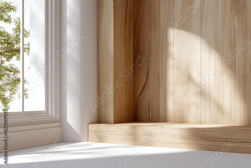 Minimalist interior corner with natural wood paneling and soft sunlight casting shadows, featuring white window frame and green foliage outside, creating calm and warm atmosphere